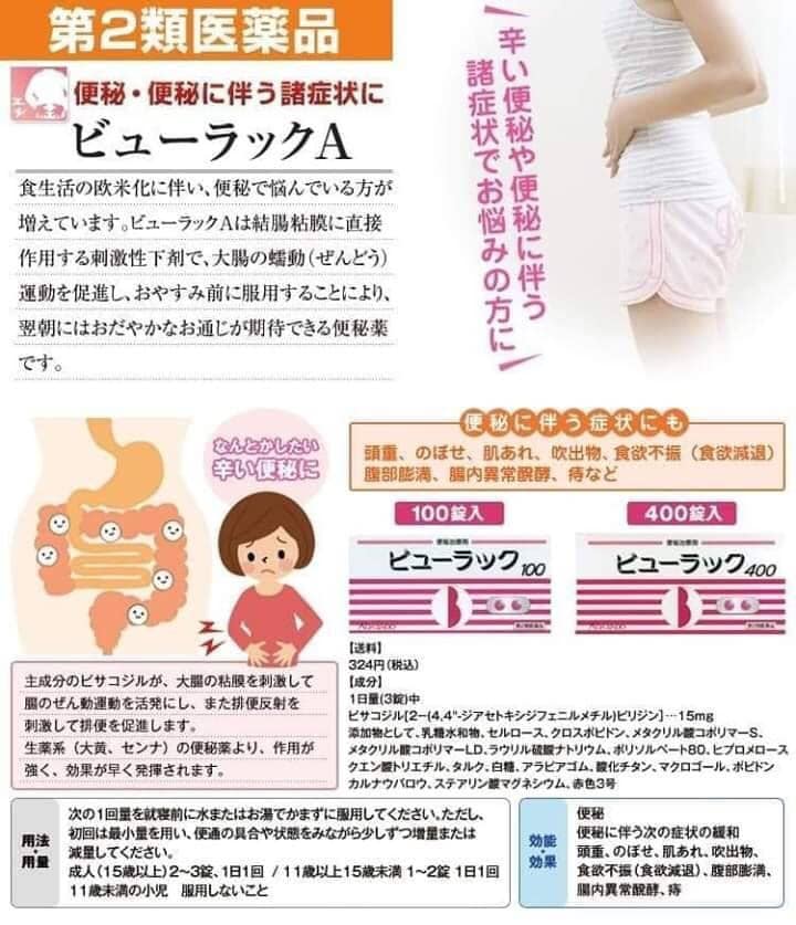 ยารักษาท้องผูกญี่ปุ่น ถ่ายท้องยาก ช่วยกระตุ้นลำไส้ให้ทำงาน มีส่วนผสมของ บิซาโคดิล หรือ ไบซาโคดิล (Bisacodyl) คือ ยาระบายเพื่อรักษาอาการท้องผูกที่ออกฤทธิ์กระตุ้นให้ผนังลำไส้ใหญ่บีบตัว ทำให้อุจจาระเคลื่อนตัวจนทำให้เกิดการขับถ่ายในที่สุด และ ส่วนผสมตัวยาจากสมุนไพร (รูบาร์บ – rhubarb,มะขามแขก (Indian Senna Leaf ) ที่เพิ่มประสิทธิภาพเป็นยาระบายอ่อนๆ แก้ปัญหาท้องผูกได้เป็นอย่างดี